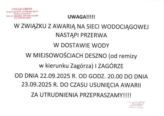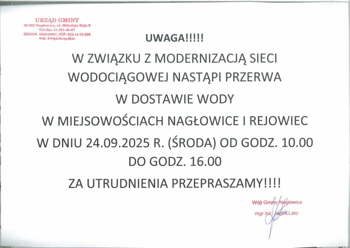 W miejscowościach: Trzciniec w dniu 19.09.2025 w godz. 9:00-15:00 Nagłowice, Deszno i Zagórze w dniu 22.09.2025 w godz. 9:00-15:00 ...