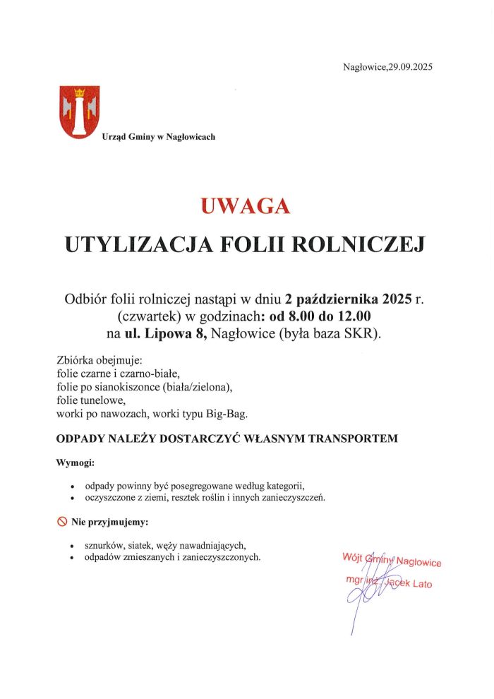 Folie rolniczą należny dostarczyć własnym transportem w dniu 2 października 2025r w godzinach 8:00 – 12:00 na ul. Lipową 8 w Nagłowicach (była baza SKR)...