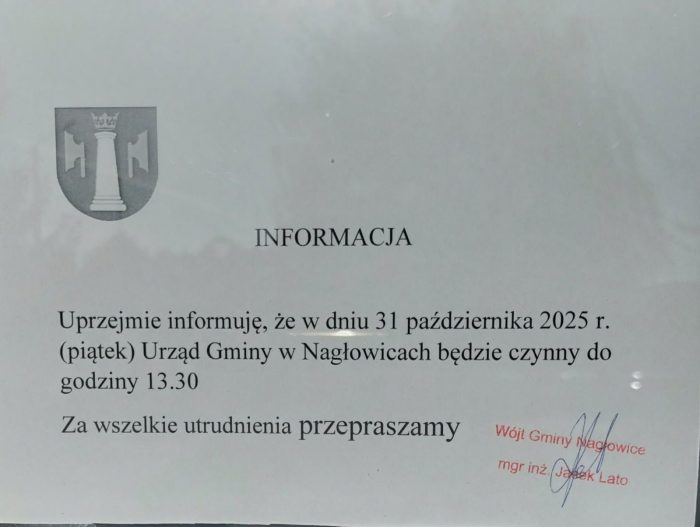 Informujemy, że w dniu w dniu 31 października 2025r. Urząd Gminy w Nagłowicach będzie czynny w godz. 7:30 – 13:30...