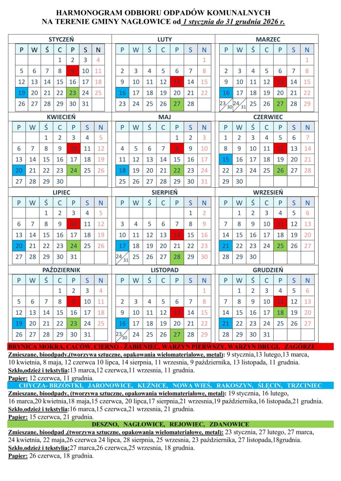 Harmonogram odbioru odpadów komunalnych na terenie Gminy Nagłowice od 1 stycznia 2026 do 31 grudnia 2026 roku