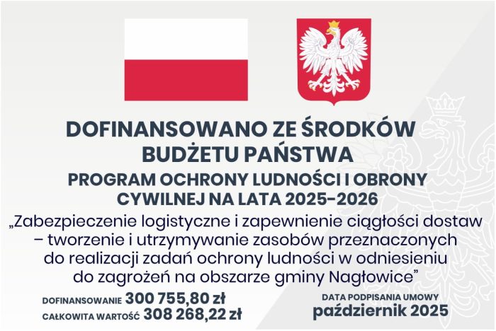 Z końcem 2025 roku zakończono realizację Programu Ochrony Ludności i Obrony Cywilnej obejmującego działania przewidziane do realizacji w 2025 roku w Gminie Nagłowice. W wyniku realizacji zadań osiągnięto rezultaty polegające...