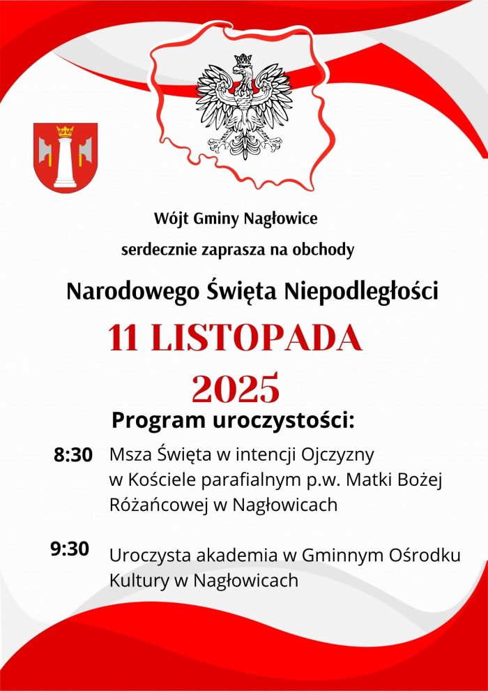 Wójt Gminy Nagłowice serdecznie zaprasza na obchody Narodowego Święta Niepodległości w dniu 11 listopada 2025 roku