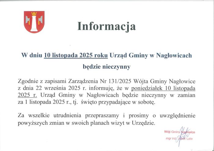 Urząd Gminy w Nagłowicach w dniu 10 listopada 2025 będzie nieczynny w zamian za 1 listopada 2025r., tj. święto przypadające w sobotę....