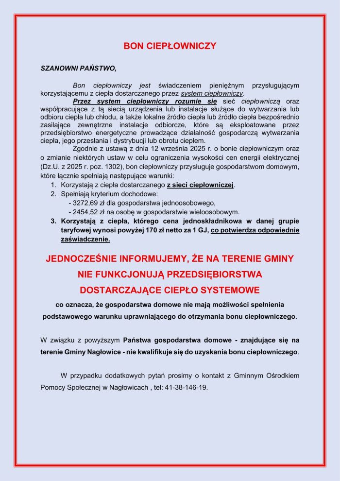 SZANOWNI PAŃSTWO, Bon ciepłowniczy jest świadczeniem pieniężnym przysługującym korzystającemu z ciepła dostarczanego przez system ciepłowniczy. Przez system ciepłowniczy rozumie się sieć ciepłowniczą oraz współpracujące z tą siecią urządzenia lub instalacje służące do wytwarzania...