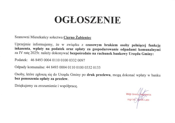 W związku z czasowym brakiem osoby pełniącej inkasenta wpłaty za podatek oraz opłaty za gospodarowanie odpadami komunalnymi za IV ratę należy dokonywać bezpośrednio na rachunek Urzędu Gminy w Nagłowicach. Rachunek bankowy do wpłat podatku: 46...