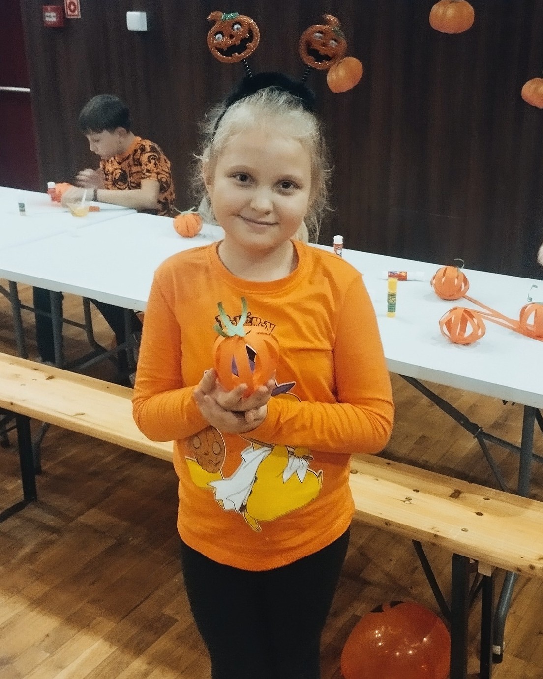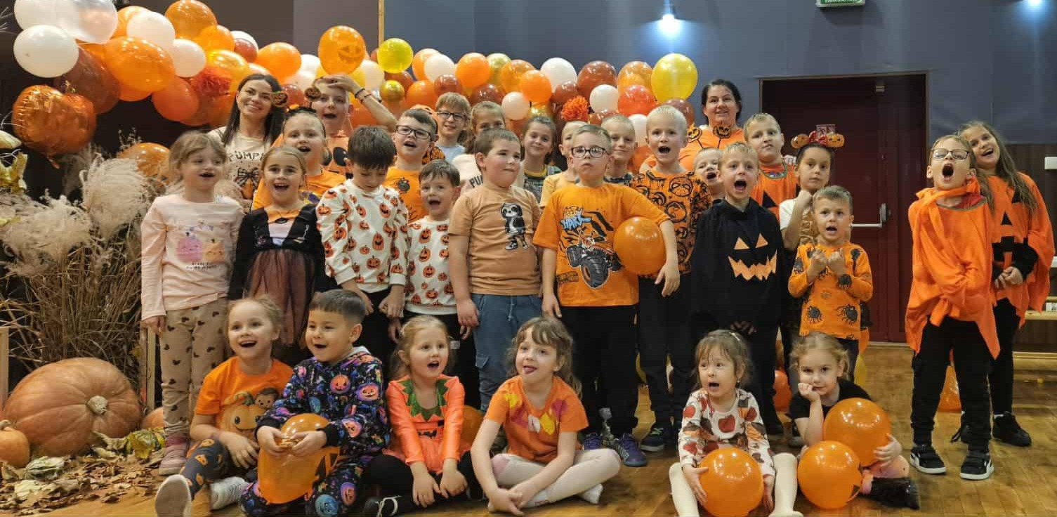 Na początku spotkania mali uczestnicy własnoręcznie przygotowywali kruche ciasteczka, które z apetytem zjedli pod koniec zajęć, popijając je zimnym mlekiem. Wspólne pieczenie było okazją do rozwijania kreatywności, nauki współpracy oraz odkrywania radości z tworzenia własnych smakołyków. To doskonały przykład na to, jak połączyć naukę z zabawą – i jeszcze z pysznym efektem końcowym! Nie zabrakło również dyniowych zabaw i konkurencji – dzieci z entuzjazmem brały udział m.in. w podawaniu dyni po wyznaczonej trasie, dyniowym slalomie czy wesołym pociągu. Całości towarzyszyły animacje muzyczne, które wypełniły salę śmiechem i pozytywną energią. Wspólna zabawa zintegrowała uczestników i sprawiła, że ten jesienny dzień był pełen ciepła, radości i dobrej zabawy. W części plastycznej mali artyści z pomarańczowych paseczków papieru tworzyli papierowe dynie – każda z nich była inna, wyjątkowa i piękna na swój sposób.
