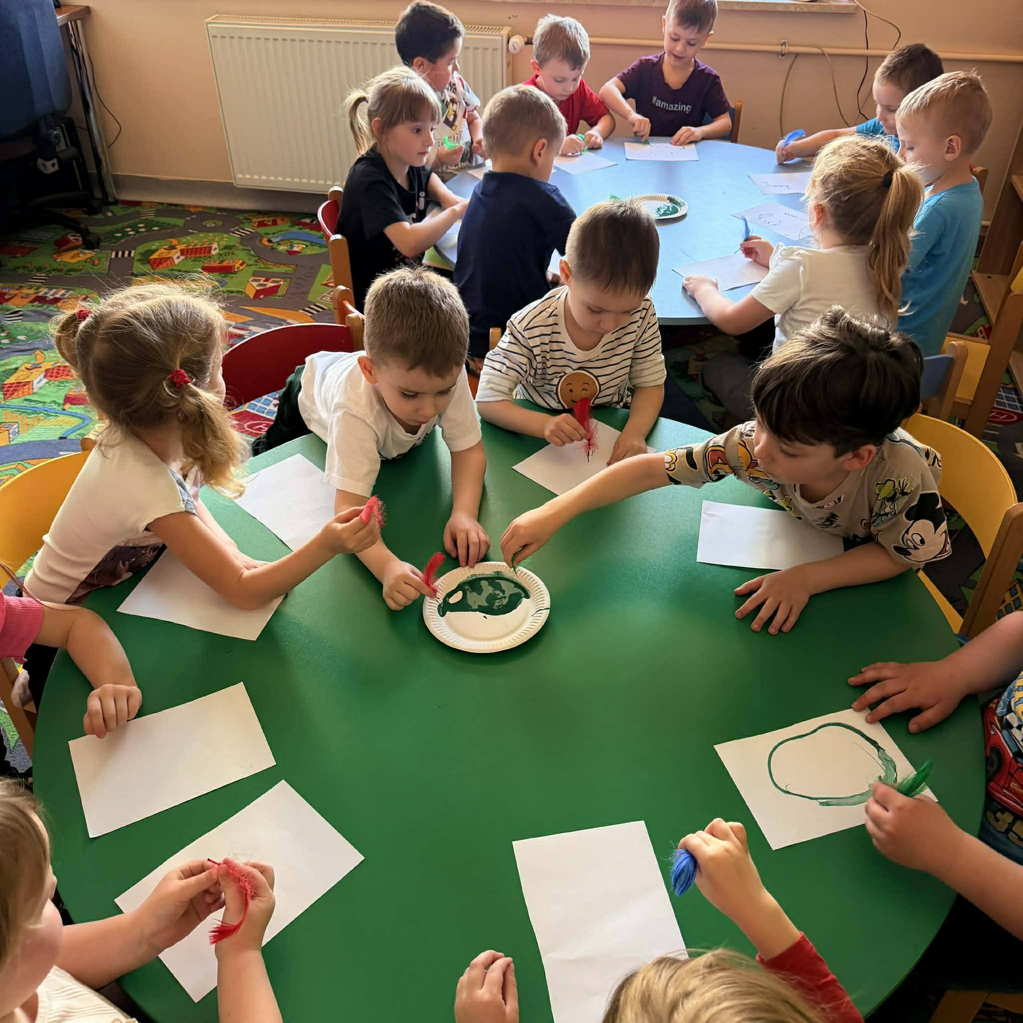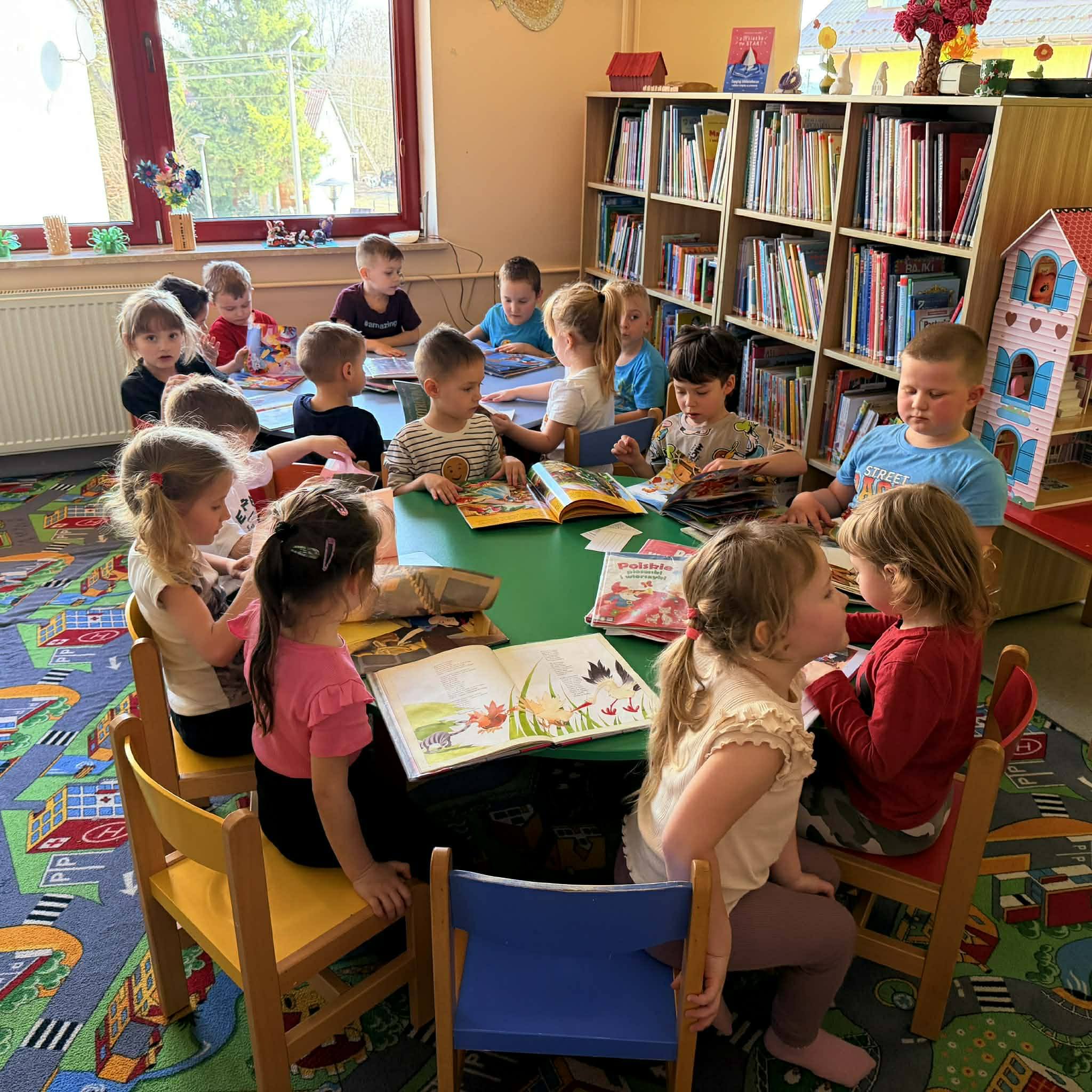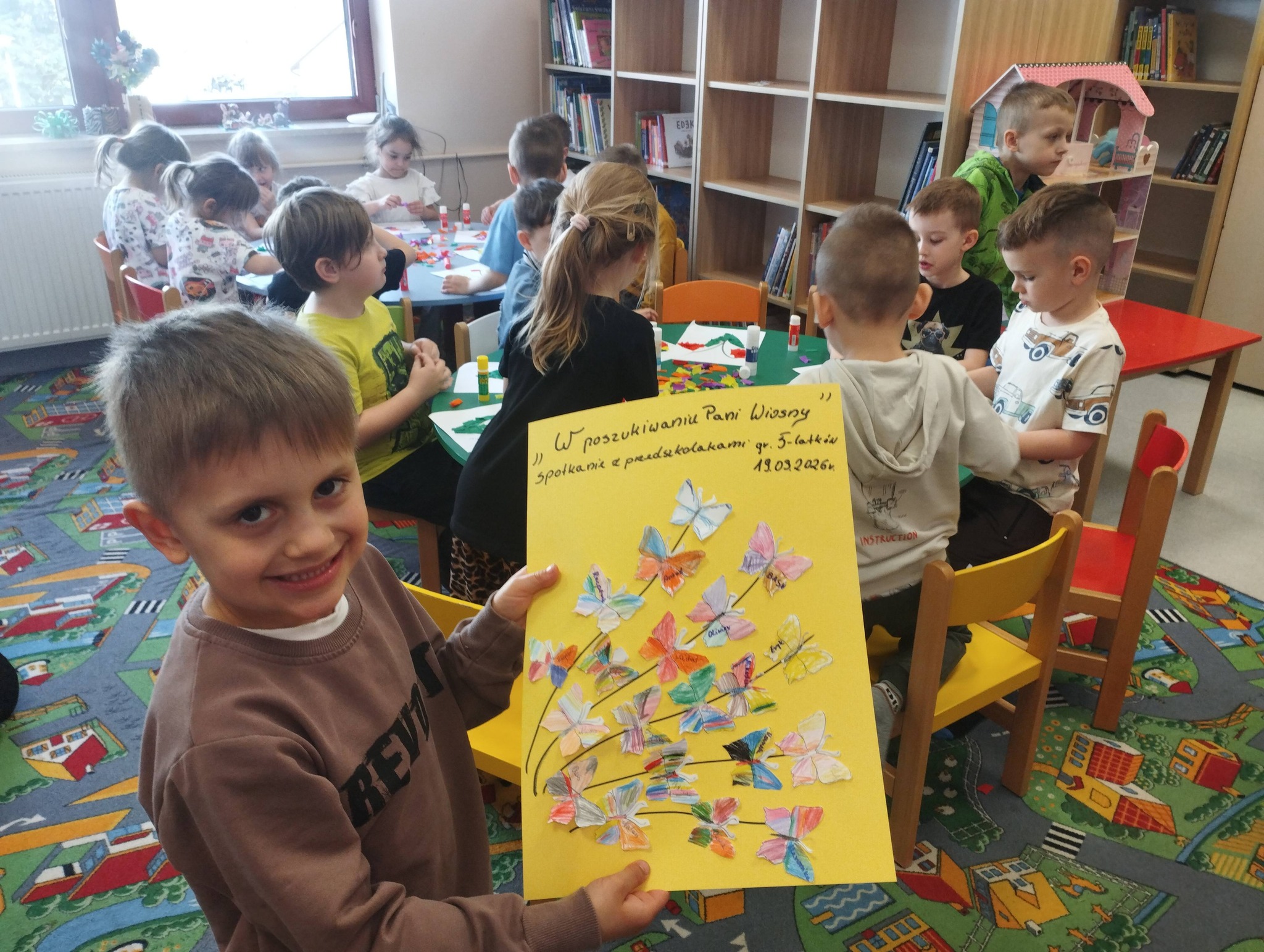 Pierwsza grupa – czterolatki – świętowała Dzień Pisarzy, wcielając się w rolę prawdziwych autorów. Dzieci rozpoczęły swoją przygodę od niezwykłej podróży w czasie, poznając tradycyjne pióro do pisania. Szybko przekonały się, że dawniej tworzenie tekstów wymagało ogromnej cierpliwości i precyzji. To doświadczenie pozwoliło im spojrzeć z podziwem na pracę dawnych mistrzów słowa. Najwięcej emocji przyniosło jednak wspólne tworzenie opowieści. Historia o księżniczce, księciu i smoku powstawała na oczach wszystkich, a pomysłowość dzieci nie miała granic. Ich spontaniczne zwroty akcji i barwne wyobrażenia pokazały, że wśród nich mogą kryć się przyszli pisarze i poeci. Po dniu pełnym twórczego wysiłku przyszedł czas na relaks i swobodną zabawę w bawialni. Z kolei pięciolatki wyruszyły na „Misję: Wiosna!”, zamieniając bibliotekę w bazę małych odkrywców przyrody. Spotkanie rozpoczęło się od rozmowy o pierwszych oznakach nowej pory roku, a następnie dzieci ruszyły między regały, by odnaleźć jej ukryte symbole. Zadania detektywistyczne, zagadki i rozsypanki nie sprawiły im żadnych trudności – mali uczestnicy wykazali się dużą wiedzą i spostrzegawczością. Kulminacyjnym punktem zajęć były warsztaty plastyczne. Kolorowe, wyklejane bibułą kwiaty zachwycały swoją różnorodnością i intensywnością barw, wprowadzając prawdziwie wiosenny nastrój. Po kreatywnej pracy przyszedł czas na ruch i zabawę w bawialni, gdzie dzieci mogły w pełni wykorzystać swoją energię.