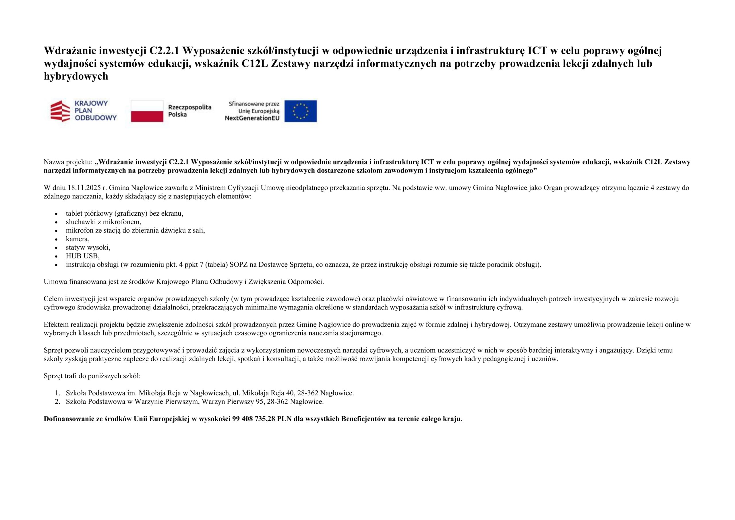 Wdrażanie inwestycji C2.2.1 Wyposażenie szkół/instytucji w odpowiednie urządzenia i infrastrukturę ICT w celu poprawy ogólnej wydajności systemów edukacji, wskaźnik C12L Zestawy narzędzi informatycznych na potrzeby prowadzenia lekcji zdalnych lub hybrydowych