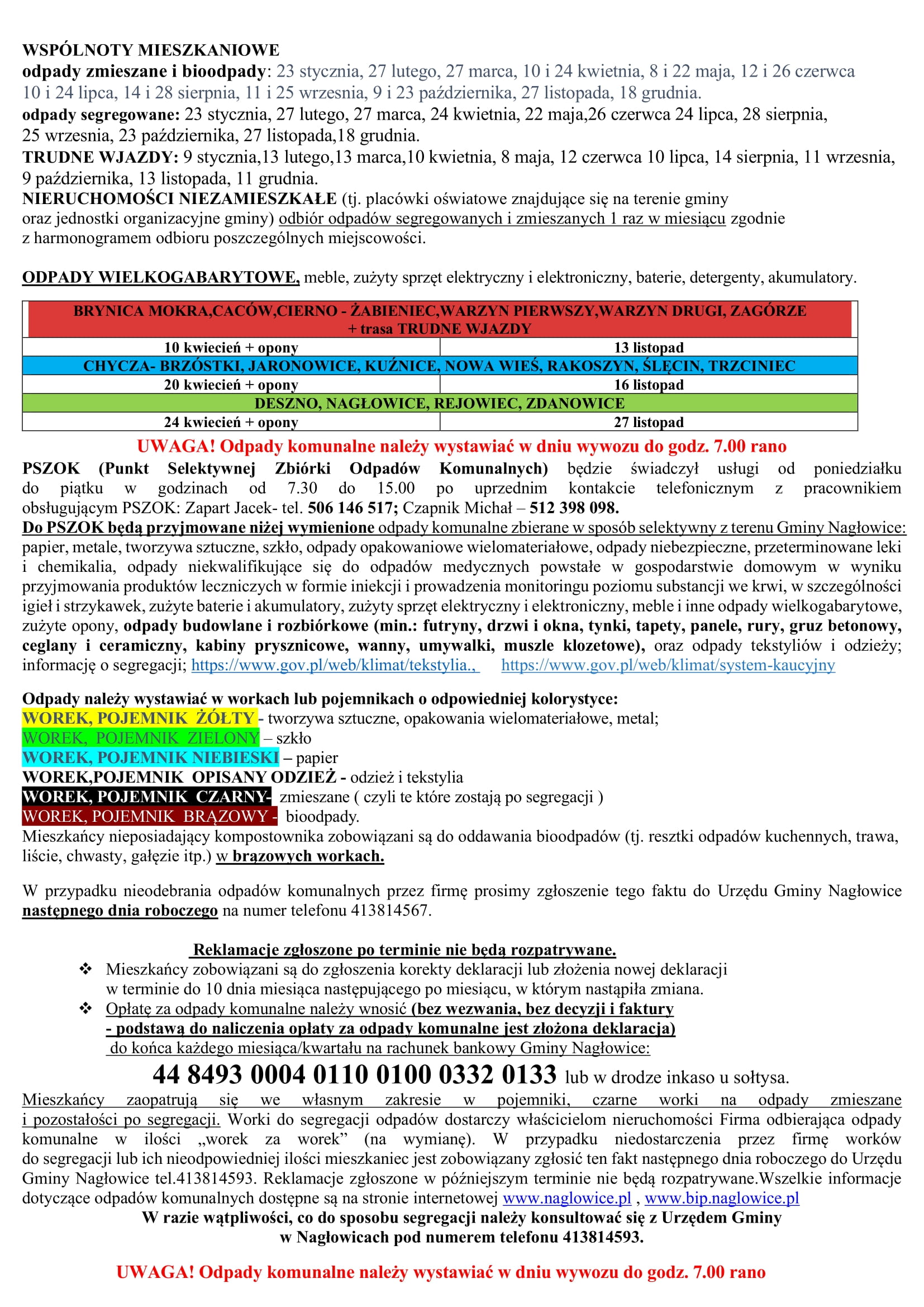 Harmonogram odbioru odpadów komunalnych na terenie Gminy Nagłowice od 1 stycznia 2026 do 31 grudnia 2026 roku