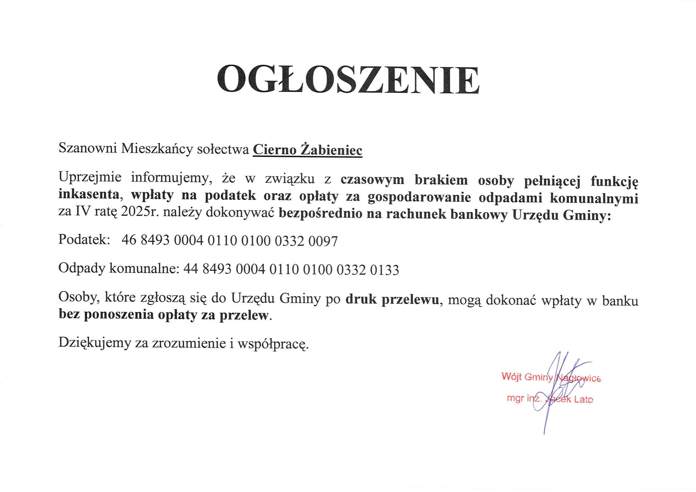W związku z czasowym brakiem osoby pełniącej inkasenta wpłaty za podatek oraz opłaty za gospodarowanie odpadami komunalnymi za IV ratę należy dokonywać bezpośrednio na rachunek Urzędu Gminy w Nagłowicach.