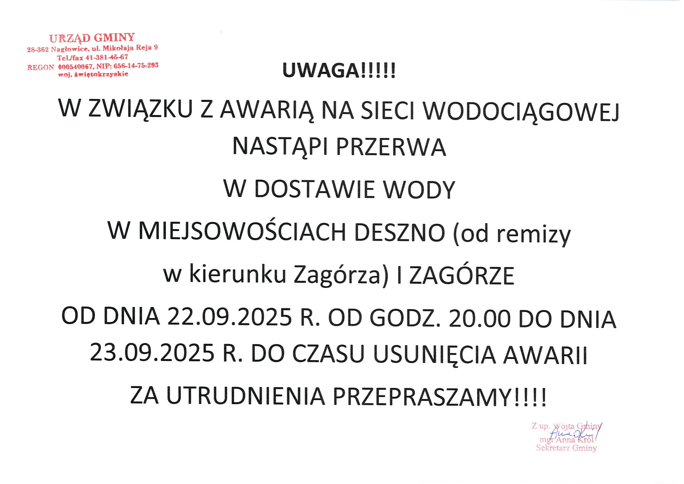 Ogłoszenie – Przerwy dostawy wody w Gminie Nagłowice w dniach 22-23.09.2025 roku