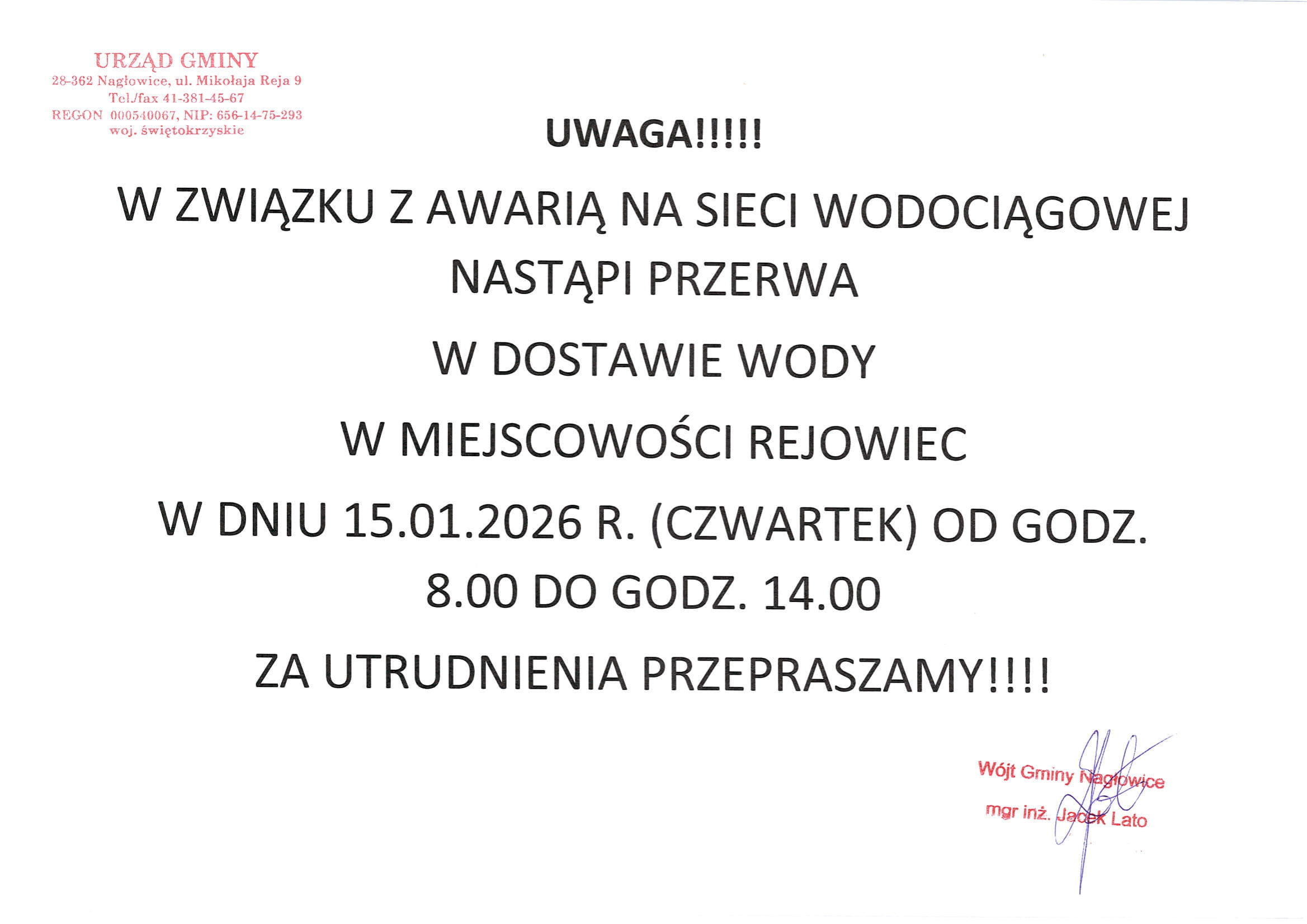 Ogłoszenie – Przerwy w dostawie wody w dniu 15.01.2026r. w miejscowości Rejowiec