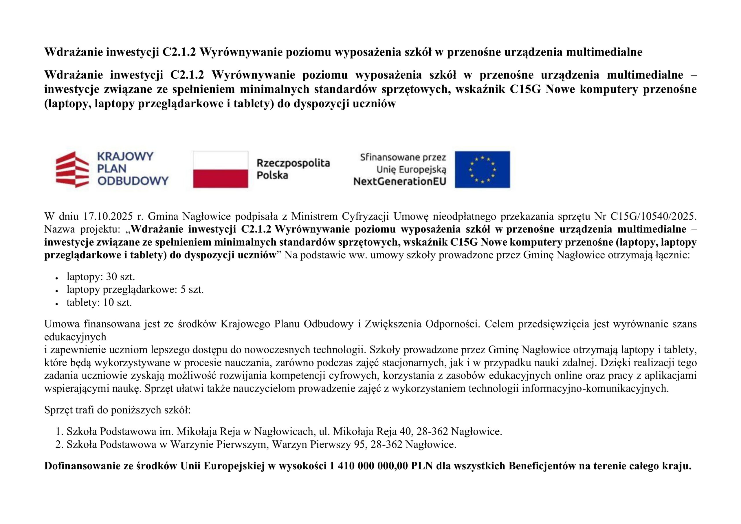 W dniu 17.10.2025 r. Gmina Nagłowice podpisała z Ministrem Cyfryzacji Umowę nieodpłatnego przekazania sprzętu Nr C15G/10540/2025. Nazwa projektu: „Wdrażanie inwestycji C2.1.2 Wyrównywanie poziomu wyposażenia szkół w przenośne urządzenia multimedialne – inwestycje związane ze spełnieniem minimalnych standardów sprzętowych, wskaźnik C15G Nowe komputery przenośne (laptopy, laptopy przeglądarkowe i tablety) do dyspozycji uczniów” Na podstawie ww. umowy szkoły prowadzone przez Gminę Nagłowice otrzymają łącznie: