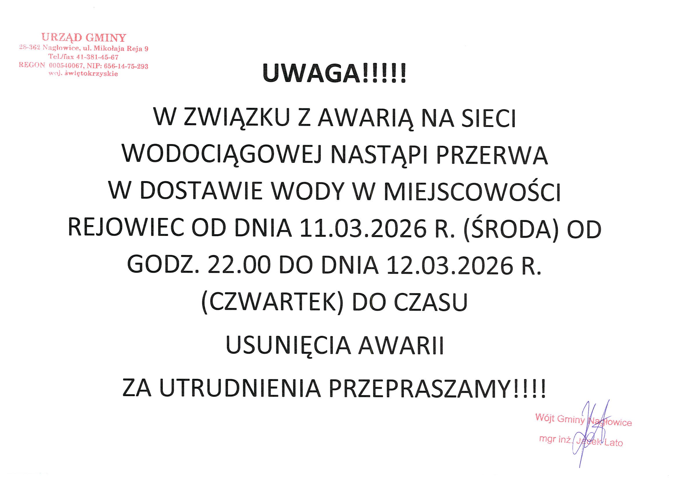 W związku z awarią sieci wodociągowej nastąpi przerwa w dostawie wody w miejscowości Rejowiec w dniach 11-12.03.2026r.