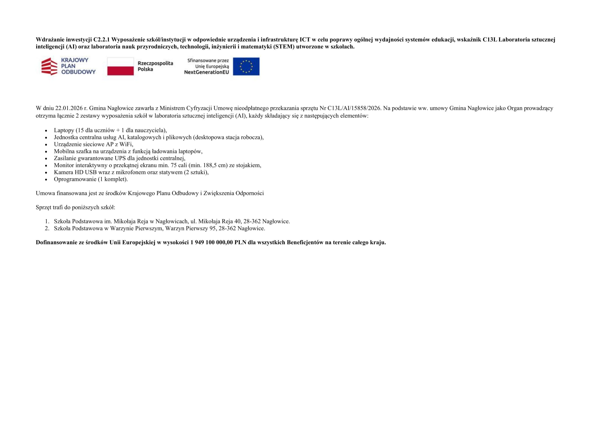W dniu 22.01.2026 r. Gmina Nagłowice zawarła z Ministrem Cyfryzacji Umowę nieodpłatnego przekazania sprzętu Nr C13L/AI/15858/2026. Na podstawie ww. umowy Gmina Nagłowice jako Organ prowadzący otrzyma łącznie 2 zestawy wyposażenia szkół w laboratoria sztucznej inteligencji (AI), każdy składający się z następujących elementów: