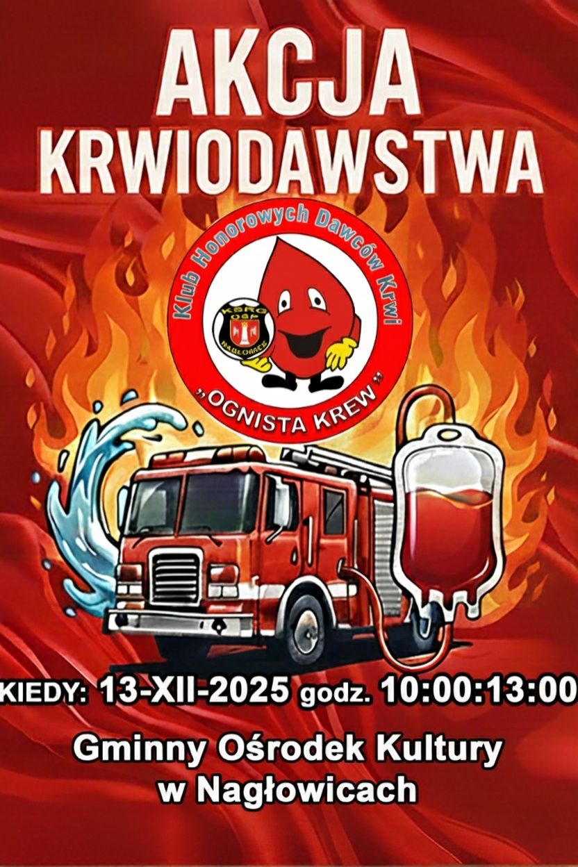 Zaproszenie na Akcję Krwiodawstwa, która odbędzie się w dniu 13 grudnia 2025r. w godz. 10:00-13:00 w GOK w Nagłowicach