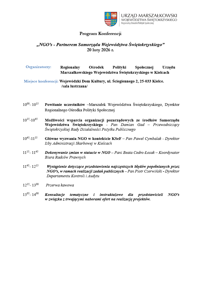 Konferencja odbędzie się w dniu: 20 lutego 2026 r. w godz. 10.00 – 14.00 w Wojewódzkim Domu Kultury im. J. Piłsudskiego w Kielcach, ul. Ściegiennego 2, 25-033 Kielce.
