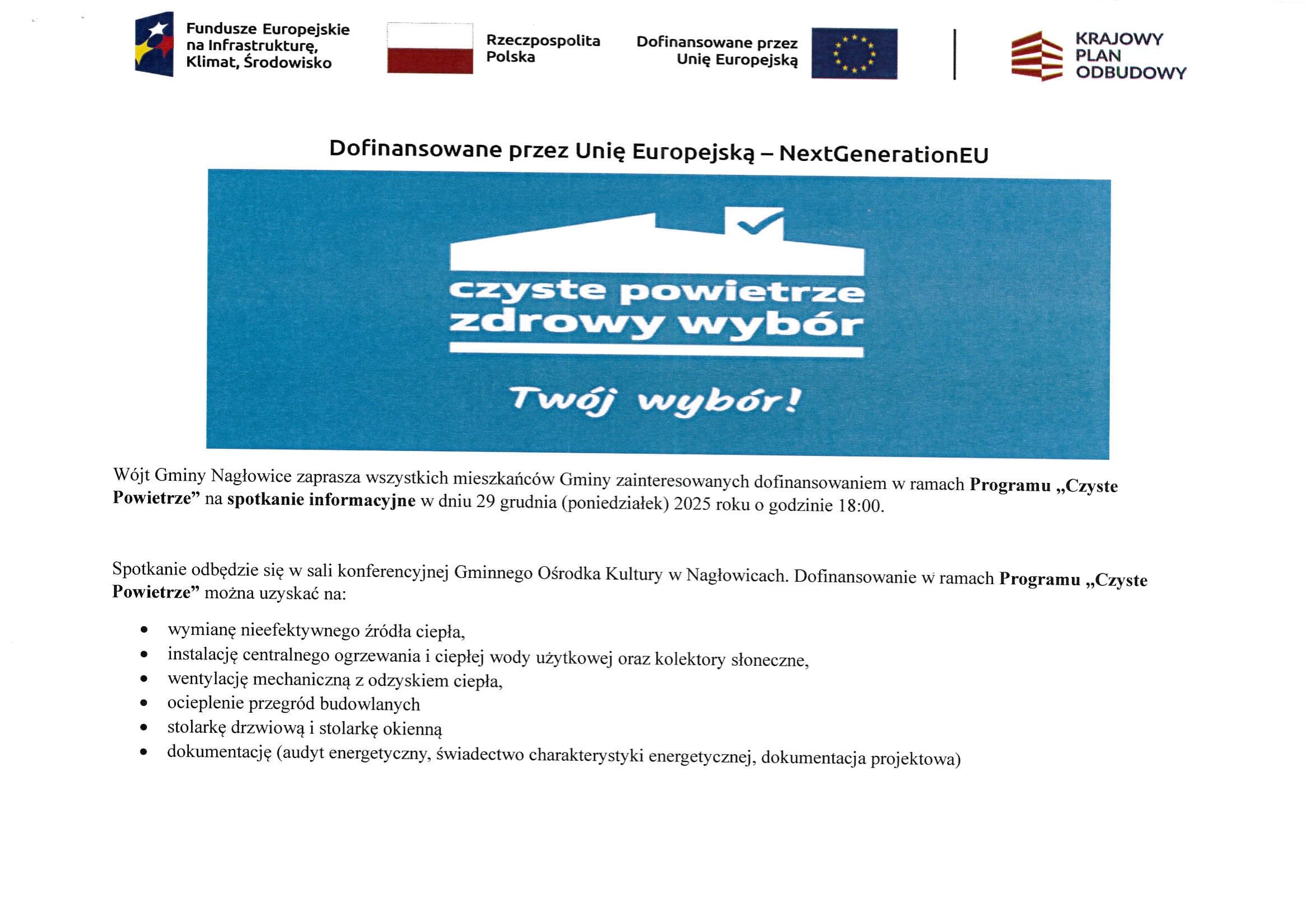 Spotkanie odbędzie się w sali konferencyjnej Gminnego Ośrodka Kultury w Nagłowicach. Dofinansowanie w ramach Programu ,,Czyste Powietrze” można uzyskać na: